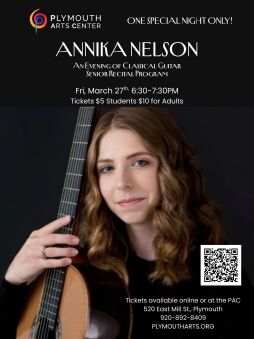 Plymouth native, Annika Nelson, a student at the University of Wisconsin–Milwaukee, will present a special senior recital as she prepares for graduation. This performance offers the greater Plymouth community an opportunity to experience the culmination of her undergraduate studies in classical guitar prior to her official graduation recital.