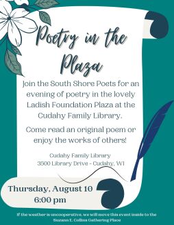 Join the South Shore Poets for an evening of poetry in the lovely Ladish Foundation Plaza. Come read an original poem or enjoy the works of others!